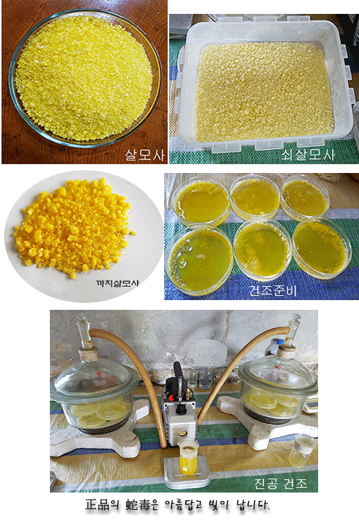 뱀독은 숙련된 전문과 체취와 건조과정 등 여러 조건으로 품질에 많은 차이가 납니다,
